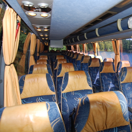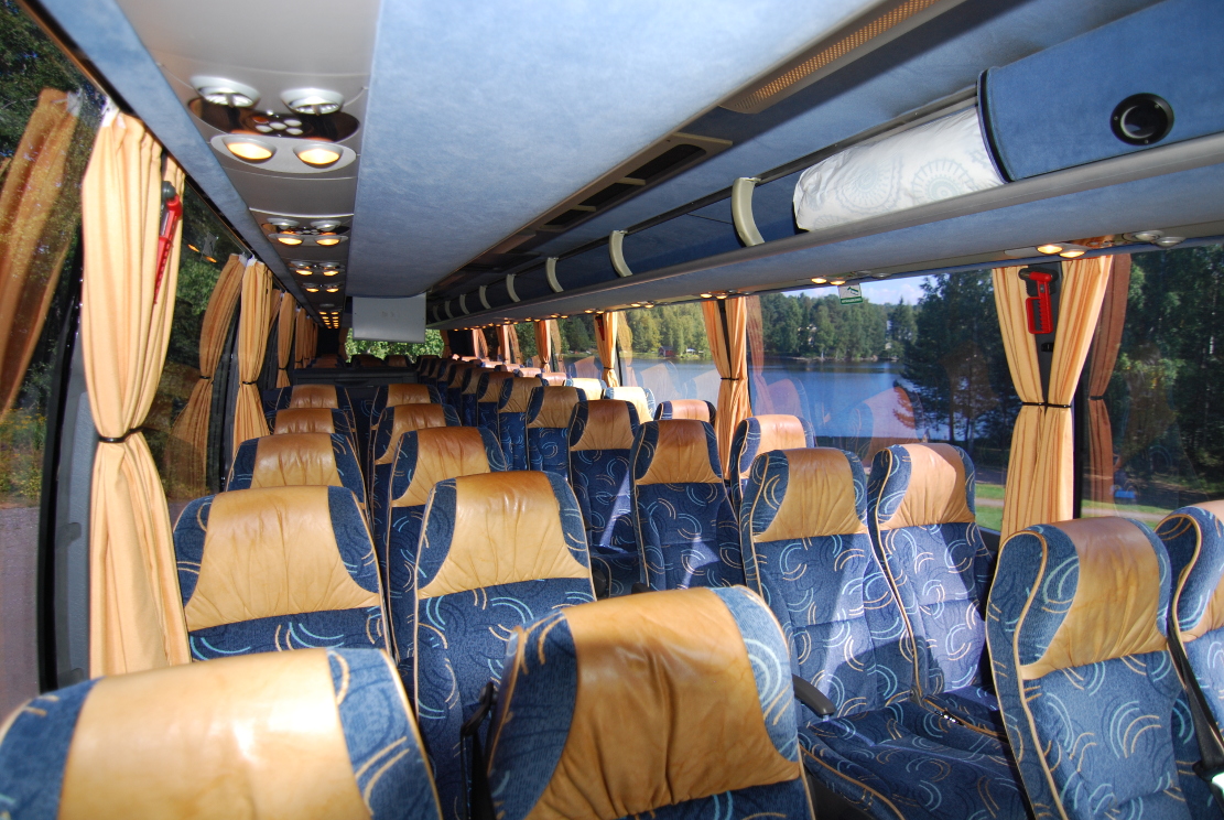 ![]() Hyvin varusteltu 50 paikkainen matka-auto Tilausliikenteen linja-autoJääkaappi Ilmastointi Runsaat tavaratilat WC Televisio CD/DVD soitin Muhkea äänentoisto (2 erillistä subwooferia) Lentokonepöydät jalkatuilla 220V sähköjärjestelmä Istuimissa sivuttaissäädöt Kaikissa istuimissa turvavyöt |
