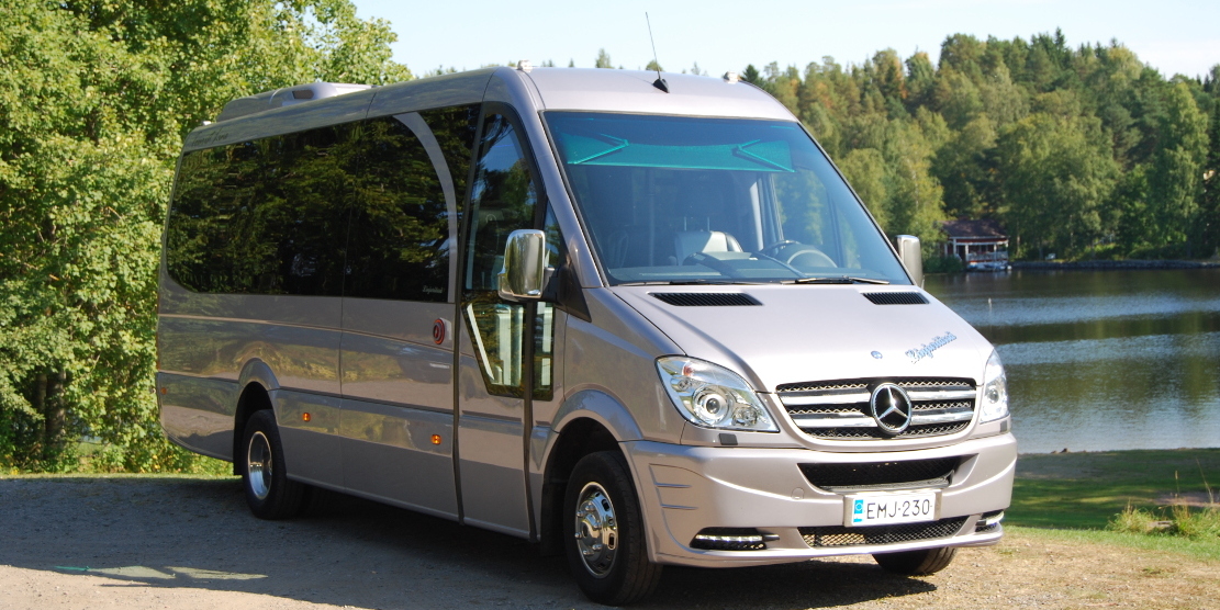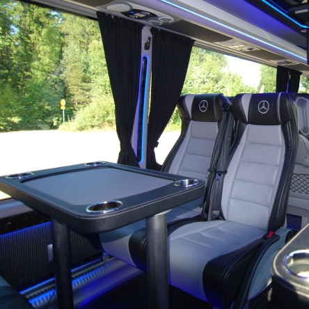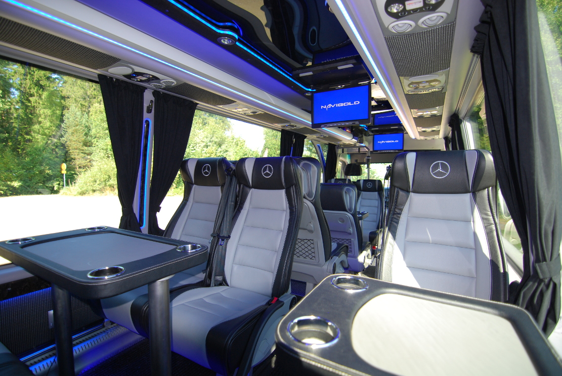 ![]() Laadukkaasti varusteltu linja-auto isokokoisilla ikkunoilla ja viihtyisillä pöytäryhmillä Linja-auto 17 istuinpaikallaMercedes-Benz Sprinter 3 pöytäryhmää Jääkaappi Kattokanavailmastointi Radio, CD, mikrofoni DVD/AUX Kaksi 17" kääntyvää TV:tä Säädettävät nahkaiset turisti-istuimet Äänieristys Syvennetty tavaratila Jatkettu kori Suuret panoraamalasit tuplalaseilla Verhot LED-valaistus 220V sähköjärjestelmä Vetokoukku Kaikissa istuimissa turvavyöt |